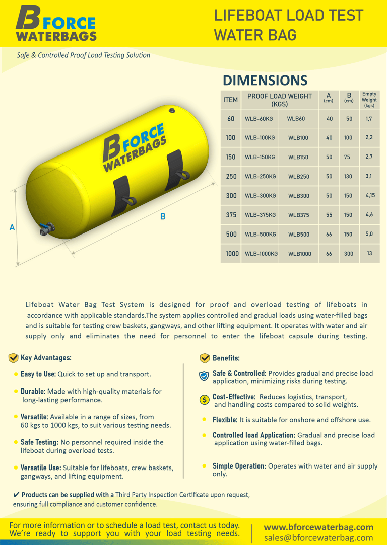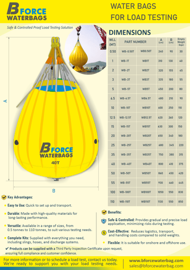 Designed for proof and overload testing of lifting equipment, BFORCE load test water bags provide precise and controlled load application. They are easy to transport, quick to install, and significantly reduce risks during testing operations.